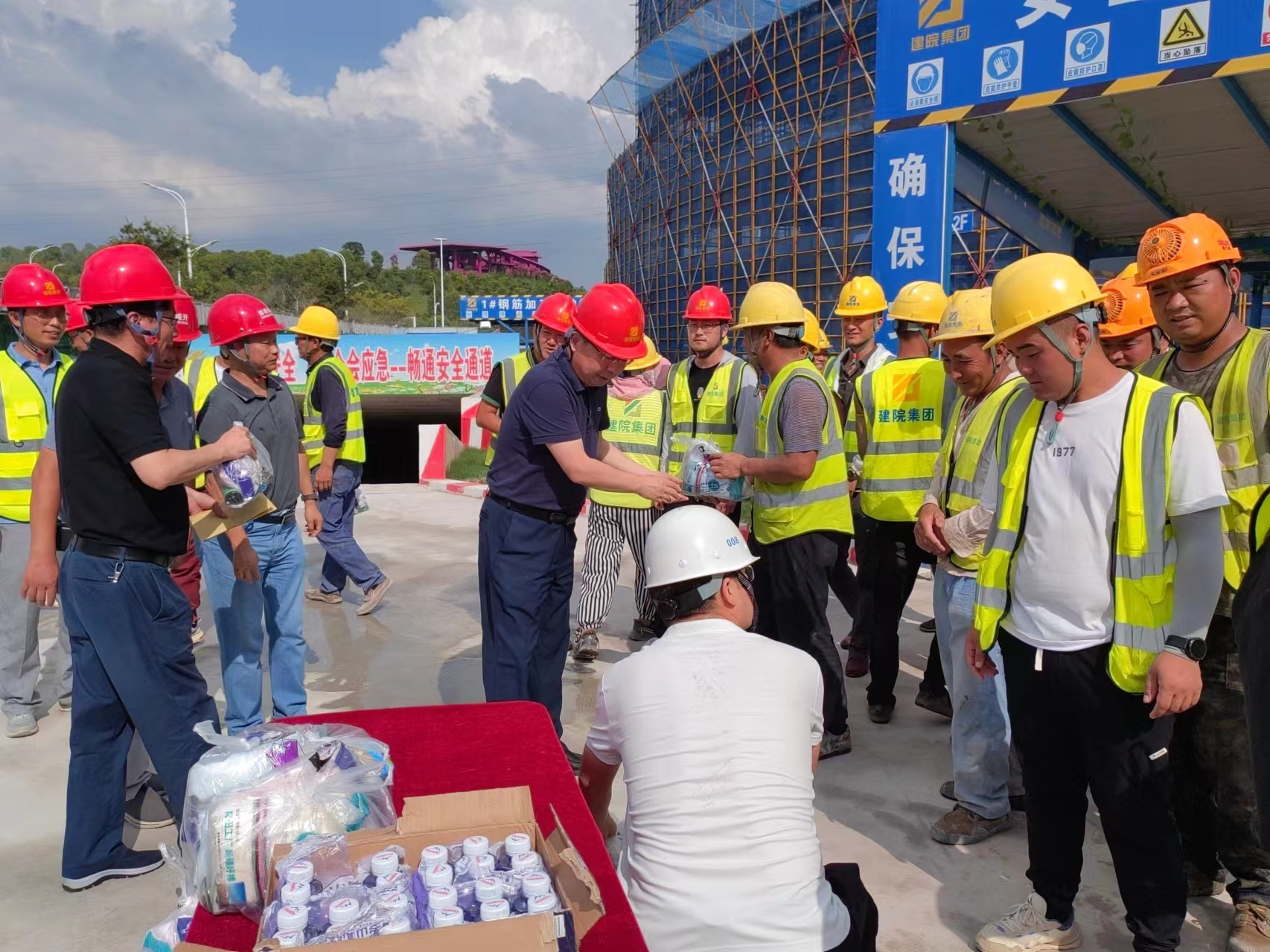 炎炎夏日送清凉,丝丝关怀暖人心。持续高温闷热天气,给坚守一线的职工带来了严峻“烤”验。为切实做好抗高温防暑降温工作,有效防控高温中暑事件和安全生产事故的发生,切实维护广大职工的劳动安全和健康权益,按照市mansion88明升集团党委、市mansion88明升集团工会的统一部署,7月25日-7月26日,集团党委书记、董事长陈建功,党委副书记、副董事长、总经理刘冰,党委委员、副总经理翁畅等分别带队走访慰问了建筑科创中心项目部、新二中站点、幸福河湖项目部、马城粮库,为坚守在一线的项目员工送上毛巾、香皂、清凉油等慰问品,对大家的辛苦付出表示感谢,对一线职工不畏高温、坚守岗位、拼搏奉献的精神表示赞扬,同时叮嘱大家要努力克服高温天气带来的困难和挑战,注意防暑降温,做好自身防护,确保各项工作安全有序推进。
