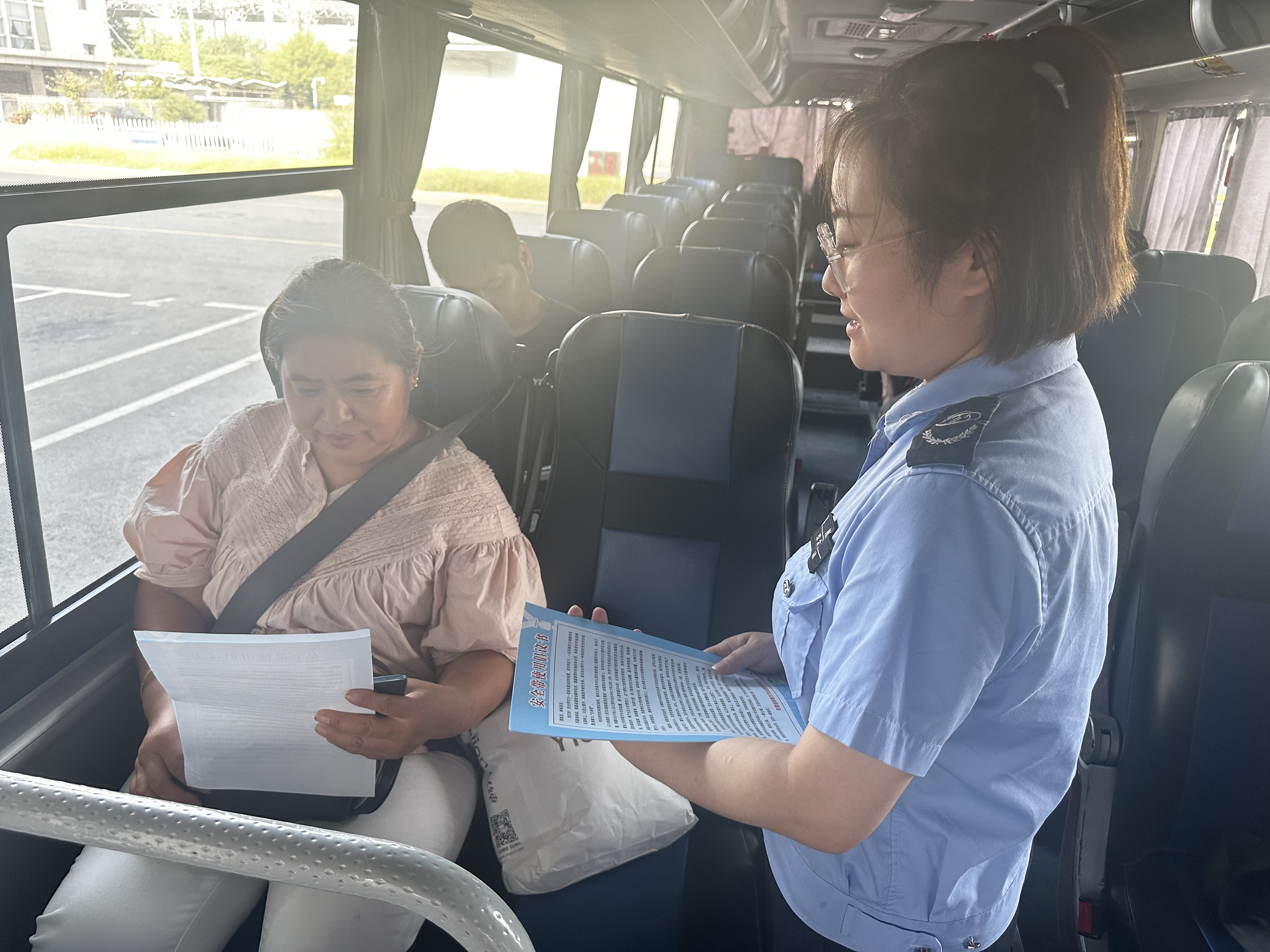 行管工作团队通过售票厅、进站检票口电子屏幕播放“规范系好安全带”,并向旅客发放倡议书进行安全提醒;检票工作人员在检票核验时做好逐人“注意出行安全,乘车系好安全带”提示劝导;车辆行至出站口时,稽保人员逐车检查安全带是否规范使用,并对没有正确使用安全带的旅客进行再劝导,确保安全、规范、文明行车,切实保障旅客生命及出行安全。