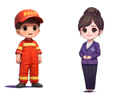 “小安”“小微”是“平安微笑蚌固路”文化品牌下的衍生形象,寓意平安与微笑,代表着S101省道蚌固路平安出行与窗口微笑服务。“小安”穿着橙色的公路养护工装,干练且富有活力。“小微”身着蓝紫色职业装,胸前佩戴“平安微笑蚌固路”胸章,专业且温和。