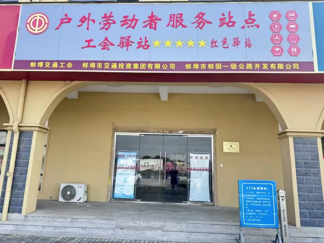 “蚌固路工会驿站”位于S101新马桥东侧服务区,配备电视机、沙发、微波炉、冰箱、便民箱、医药箱、AED除颤仪、血压仪等便民服务设施。除此之外,还配有免费的手机充电站、雨伞架、冷热双温功能的饮水机、雨伞、报纸、书刊、有声图书等生活娱乐设施。自投入使用以来,开展了“红五月”“礼遇劳动模范,致敬劳动者”“凝聚她力量”等系列志愿活动,为户外劳动者提供“冷能取暖、热能纳凉、疲劳可休息、受伤有救助”的“避风港”。截至目前,共服务新业态群体2000余人,作用发挥明显,受到了广大户外劳动者的好评。