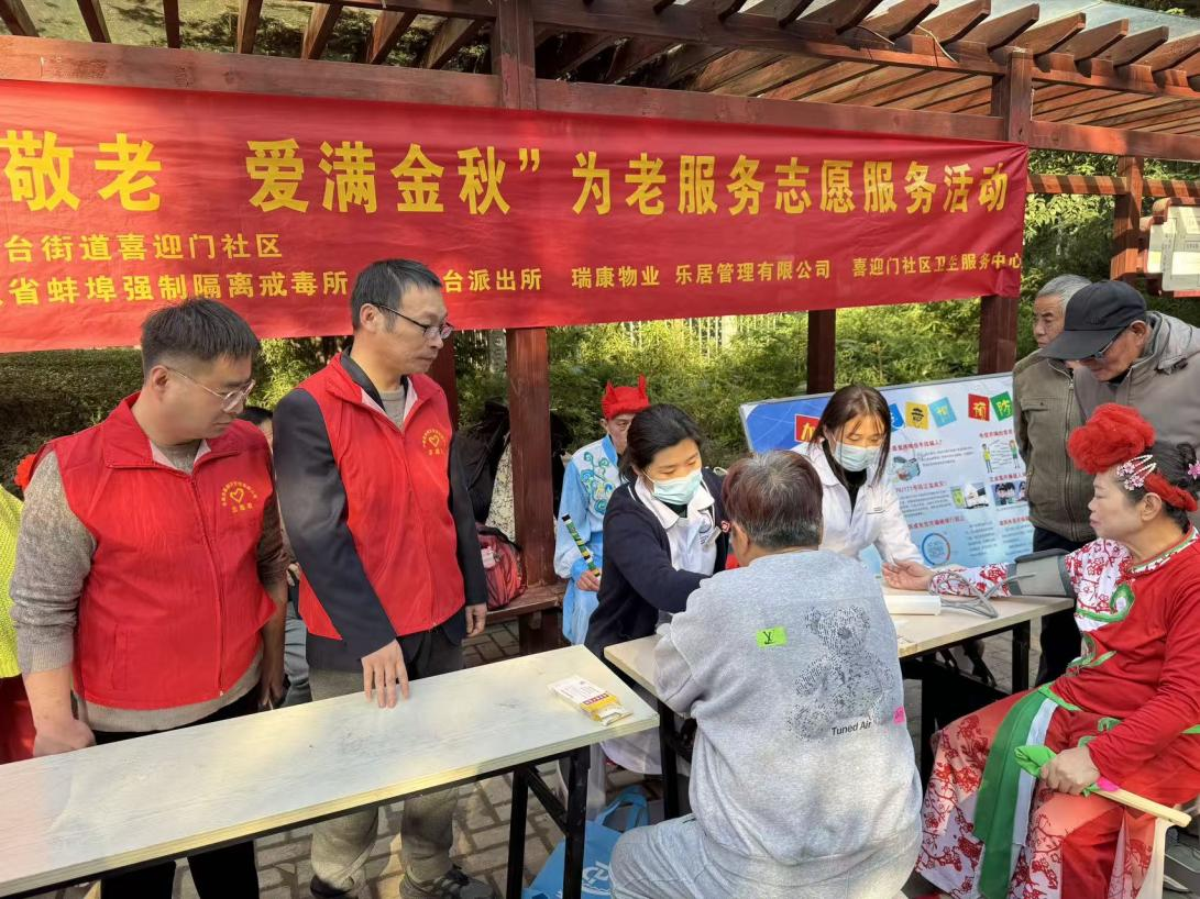 津有味,不时点头鼓掌,还跟着旋律轻声跟唱,脸上洋溢着幸福的笑容。汇演一侧的便民服务区同样人气十足,房管员联动社区卫生服务站开展义诊,医护人员耐心为老人们免费测量血压、检测血糖,细致解答慢性病用药规范、秋冬养生保健等问题;专业理发师坐镇义剪专区,根据老人们的需求精心修剪发型,让大家以清爽整洁的模样欢度佳节;针对行动不便、无法出门的老人,工作人员主动上门探望,随身携带血压仪、常用药品与节日慰问品,把关怀送到老人心坎上。此次活动共吸引100余名老年居民参与,大家纷纷点赞:“在家门口就能看戏、做检查,感谢党和政府让我们的日子过得既踏实又暖心!”